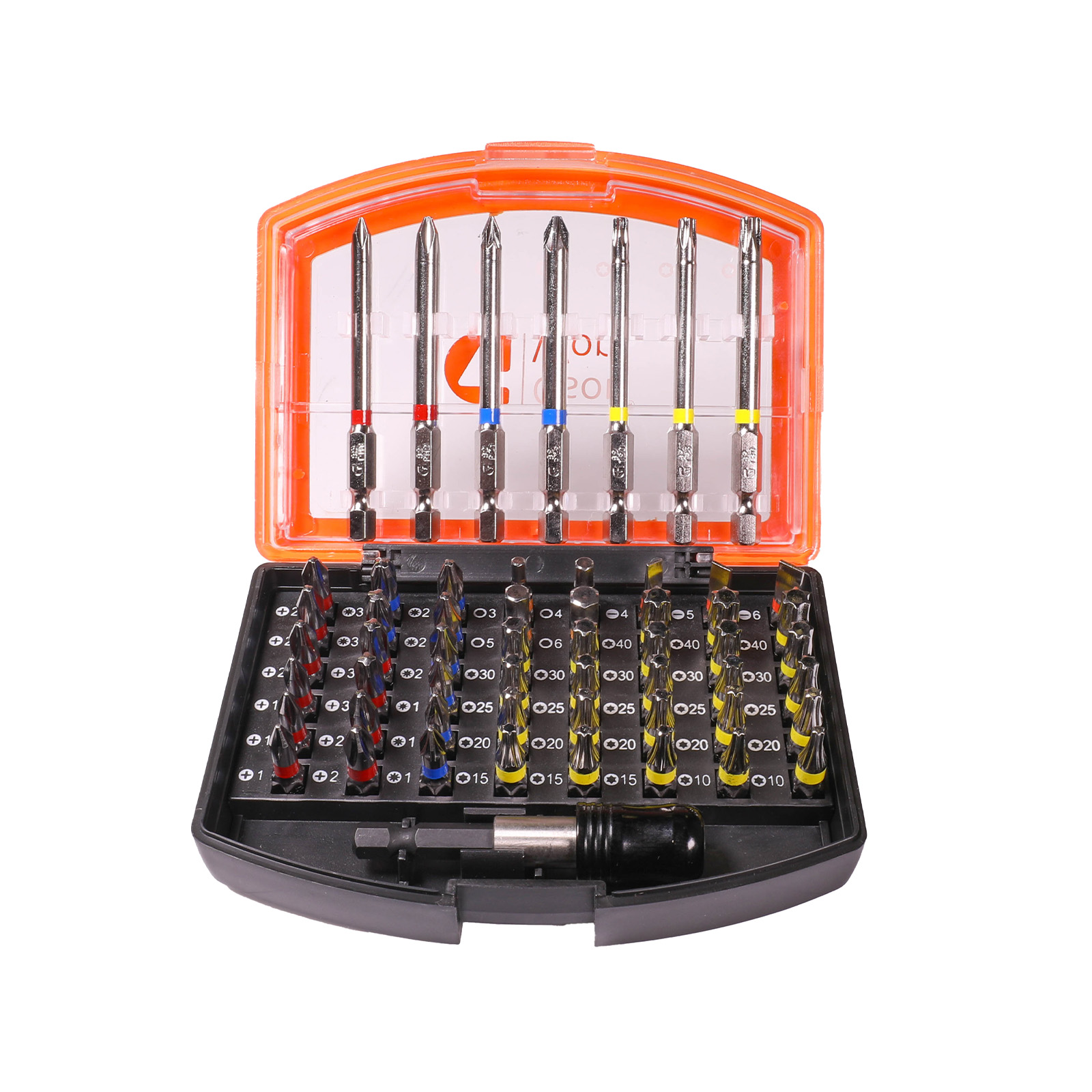 Färgkodade bits av högkvalitativt S2-stål. Färgkodningen gör det lättare att hitta rätt bits.