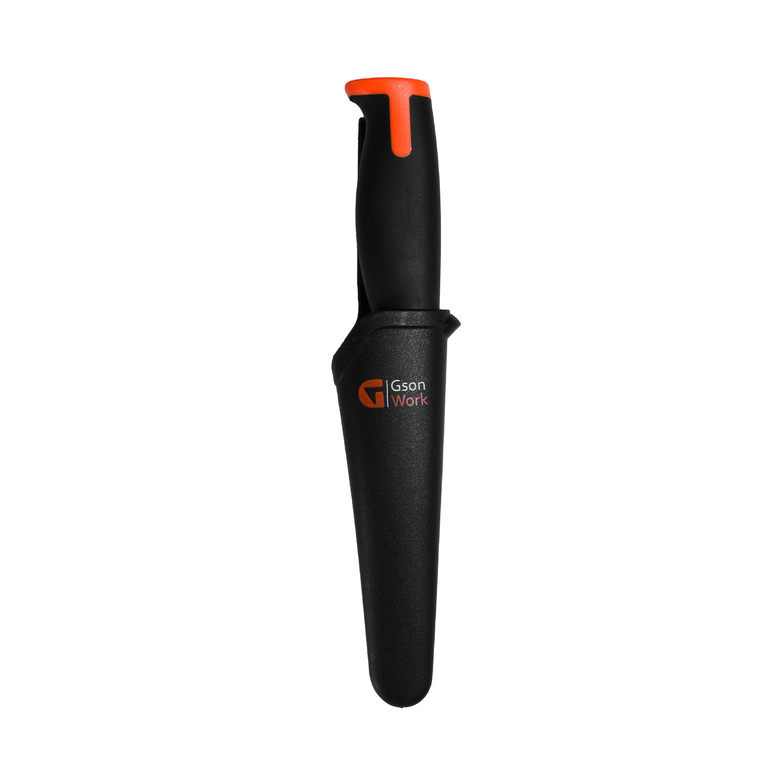 Hantverkarkniv med 25 mm tjockt rostfritt blad. Härdat HRC 58-60. Greppvänligt gummerat handtag med fingerskydd. Fodral i PP med hållare för knapp och bälte.