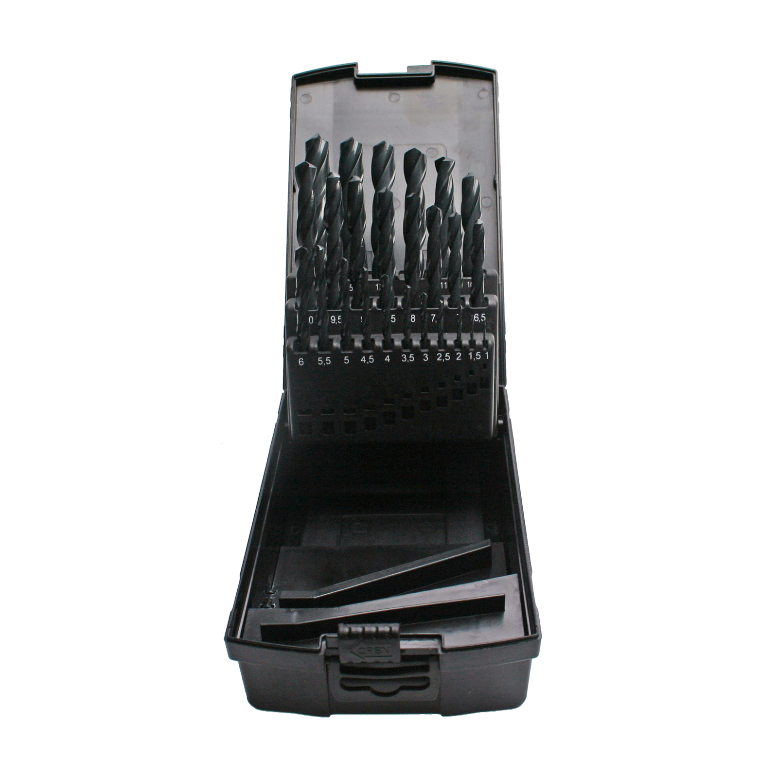 Produkt: HSS-R Drill Set 1-13 mm|Innehåller: 25 delar: 1x Ø 1-13 / 05 mm steg|Antal i kartong: 10